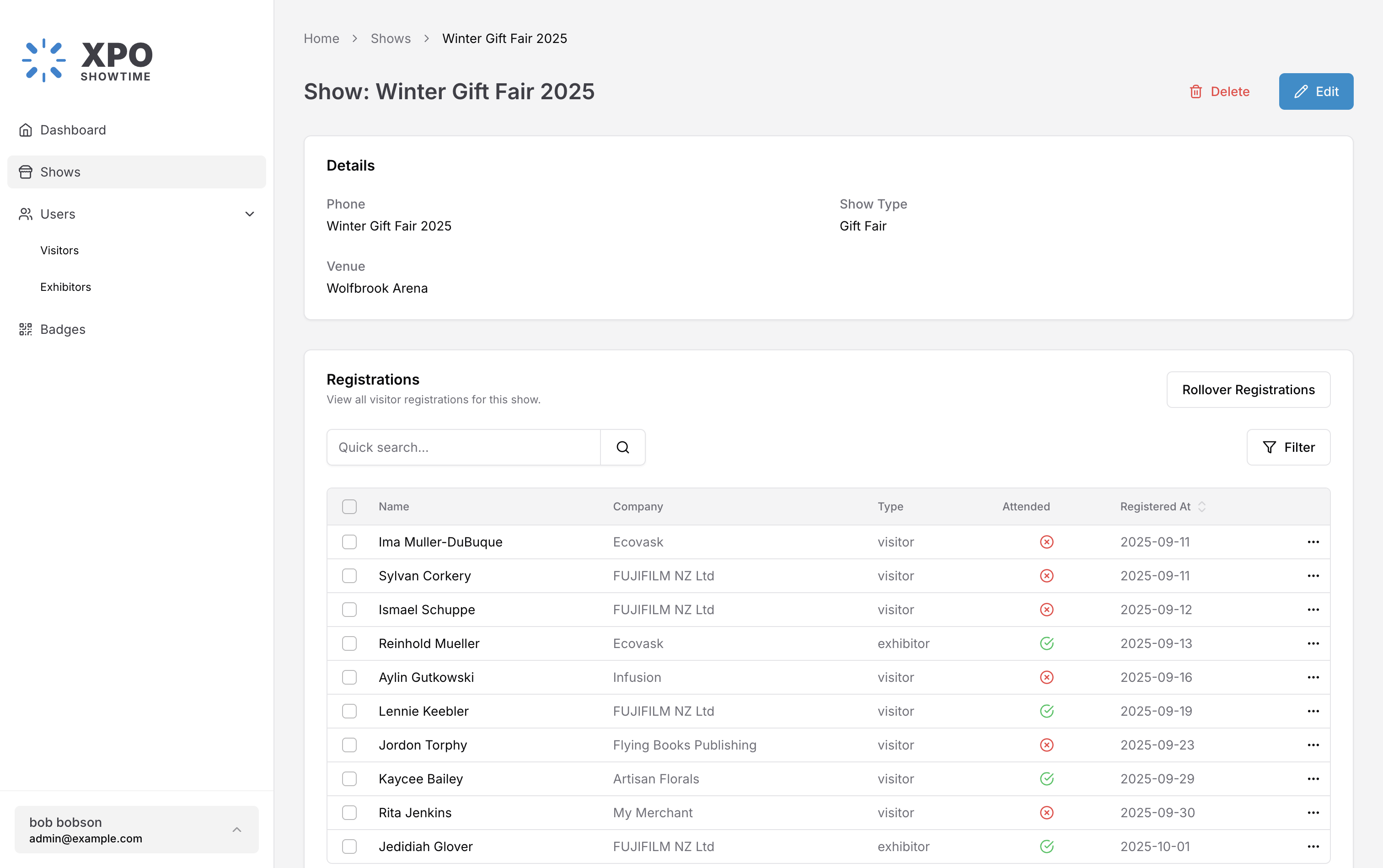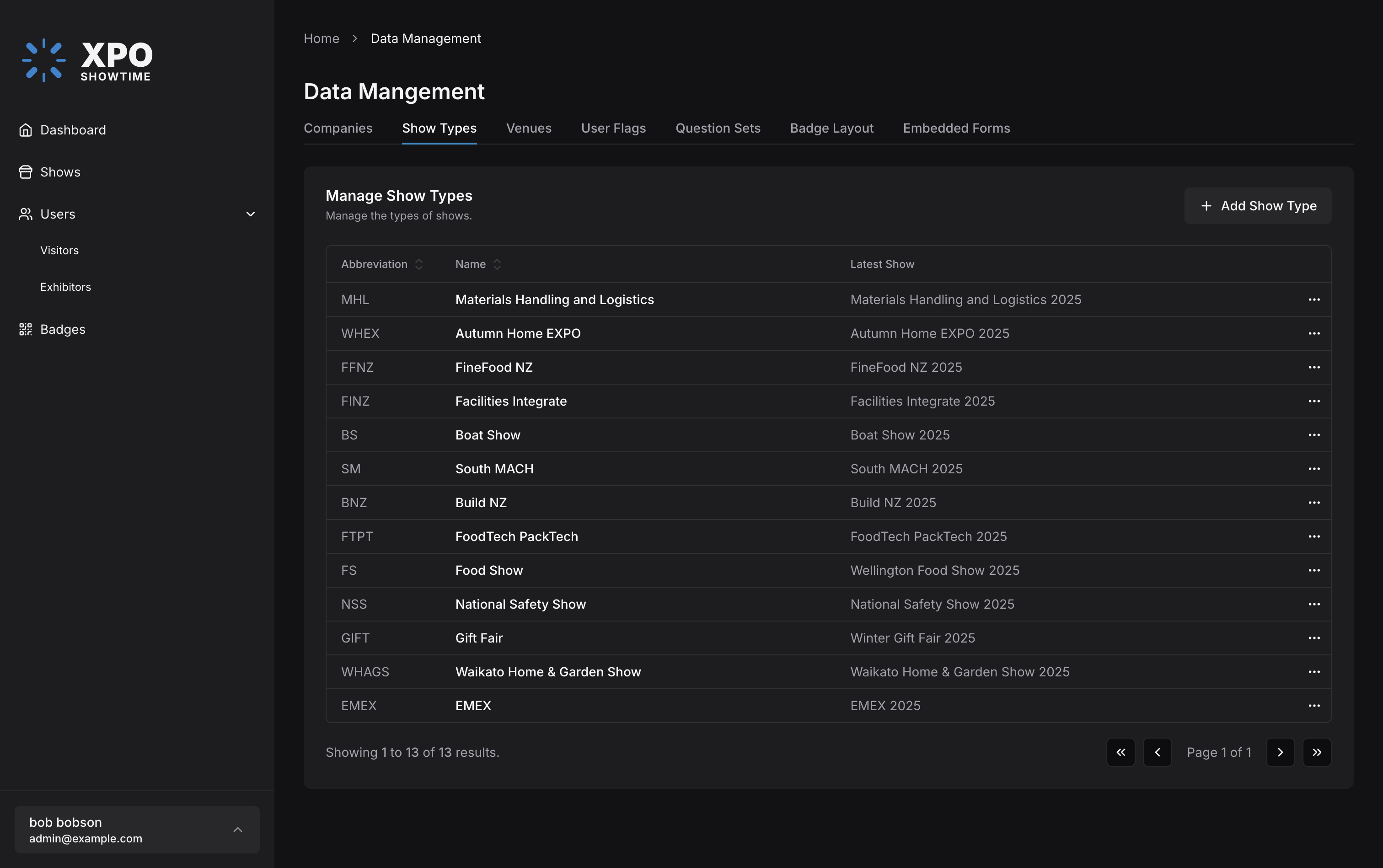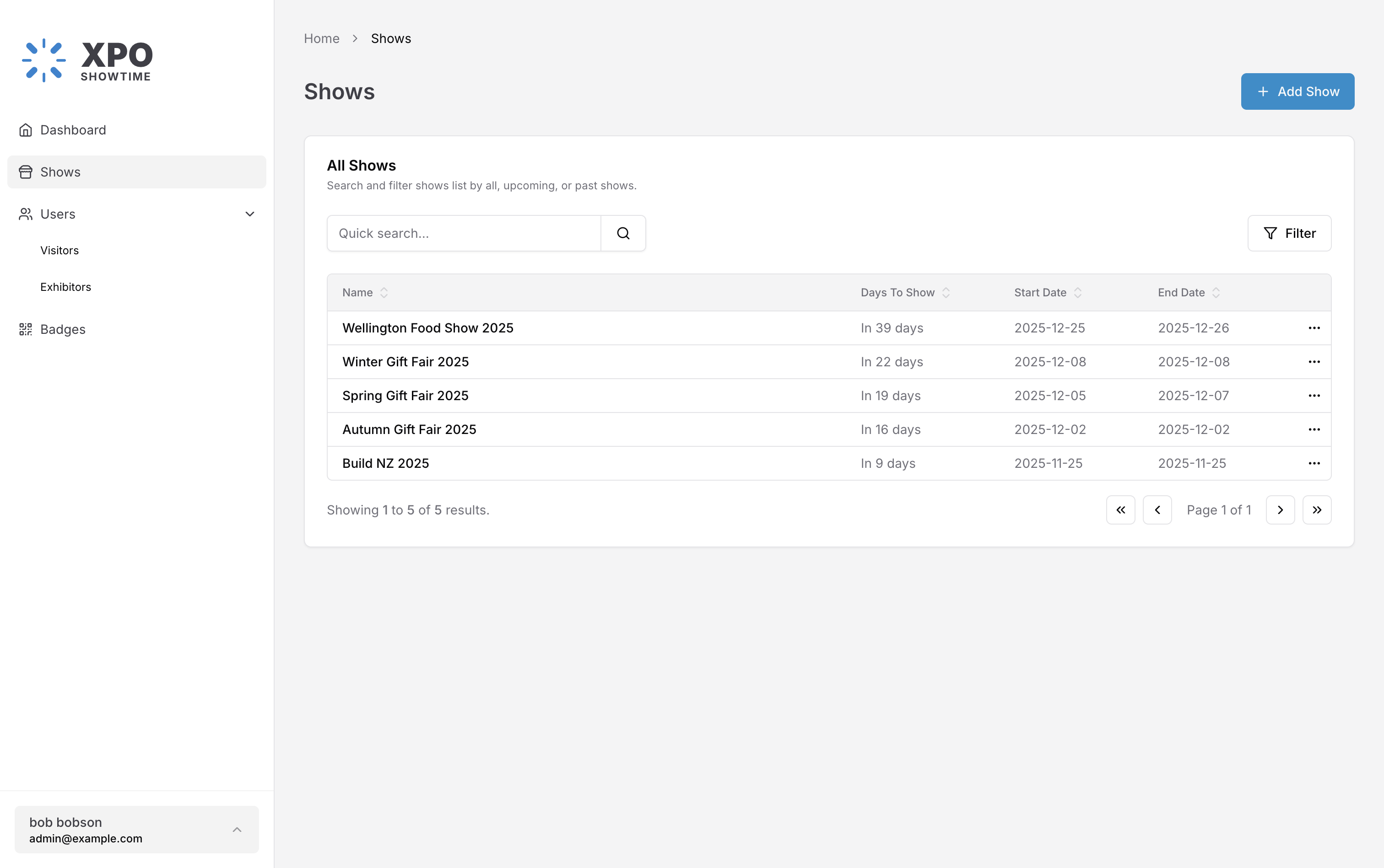 XPO Showtime is a web app designed for an NZ company that runs trade shows. It allows users to easily manage upcoming shows, handle exhibitor and visitor registration and manage printable badges.