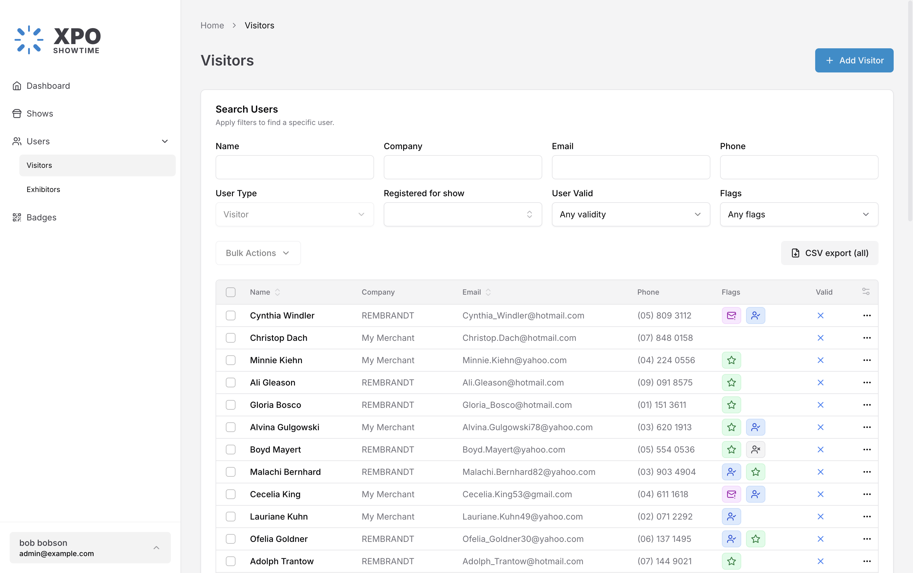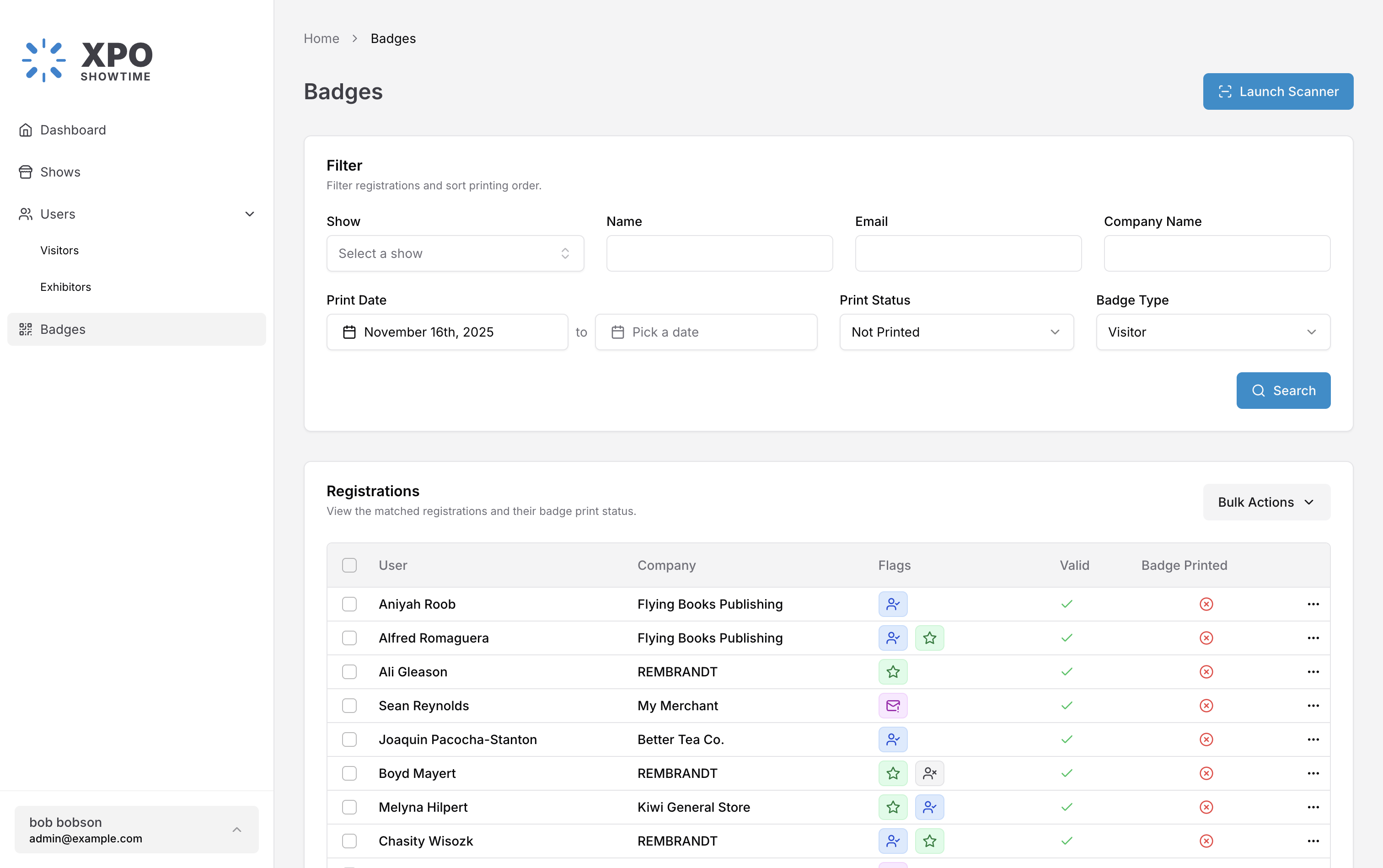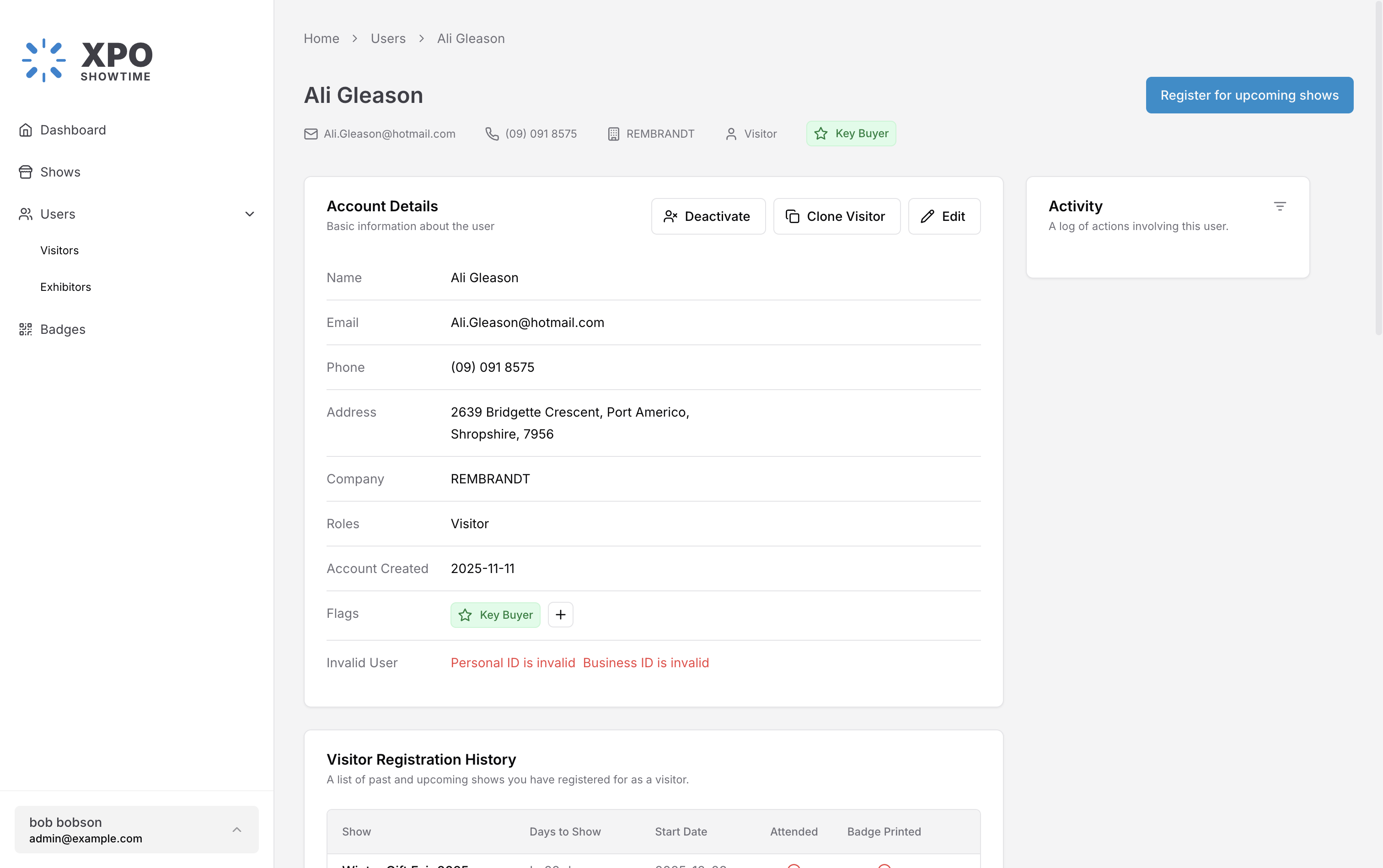 XPO Showtime is a web app designed for an NZ company that runs trade shows. It allows users to easily manage upcoming shows, handle exhibitor and visitor registration and manage printable badges.